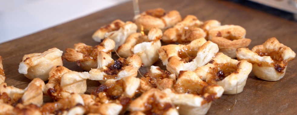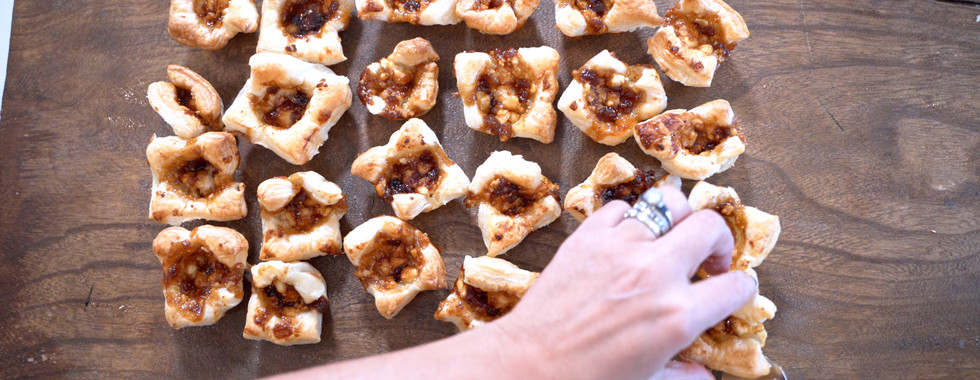 Gently press each square into a mini muffin cup or mini tart pan, forming little cups. Prick the bottoms of the pastry cups with a fork to prevent them from puffing up too much.Â