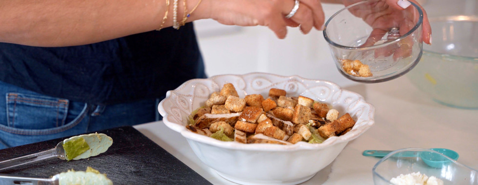 The key to giving this a Greek twist is adding the feta in lieu of Parmesan, sliced olives, and tahini, while keep the traditional components of a romaine-based Caesar salad. I also keep the croutons the same and add chicken for protein to make it a meal. I should note that this would taste excellent with grilled shrimp or broiled salmon on top for your protein. Also, if you want to make this into a side salad you can easily omit the protein altogether