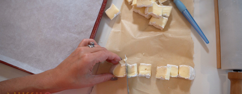 Arrange the thinly sliced Brie cheese on top sour cherry, covering the surface of each pastry square.