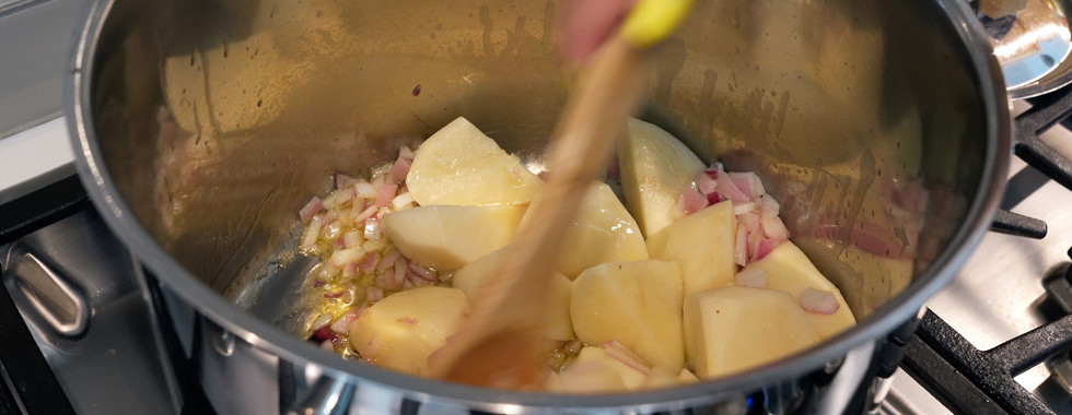 Saute the red onion until softened, about 5 minutes. Then add the potato and saute the pieces for about 3 minutes.